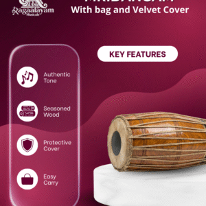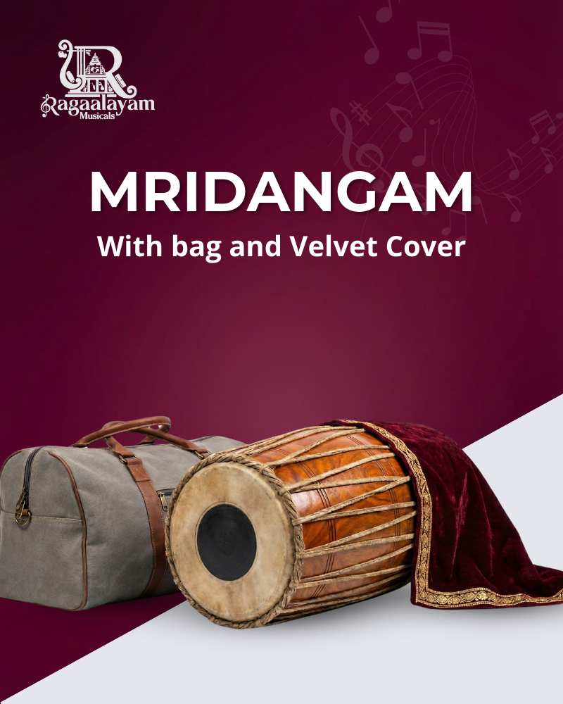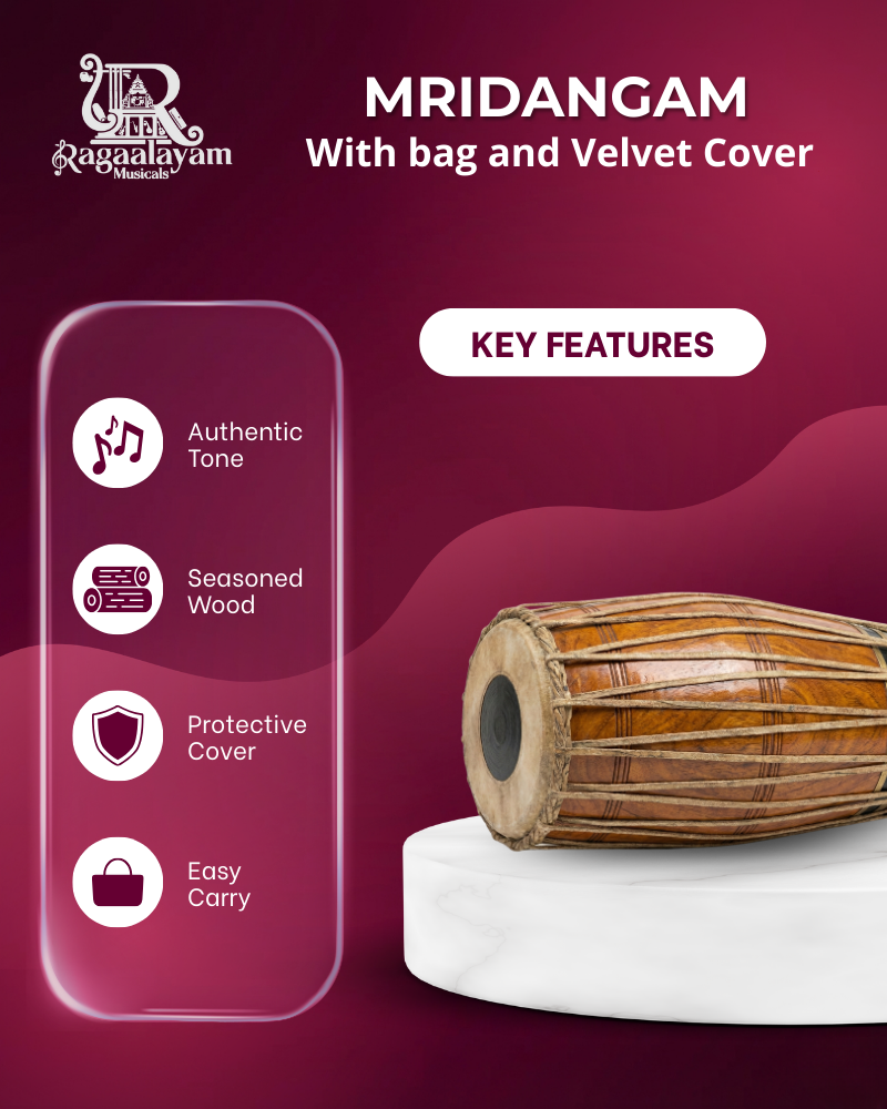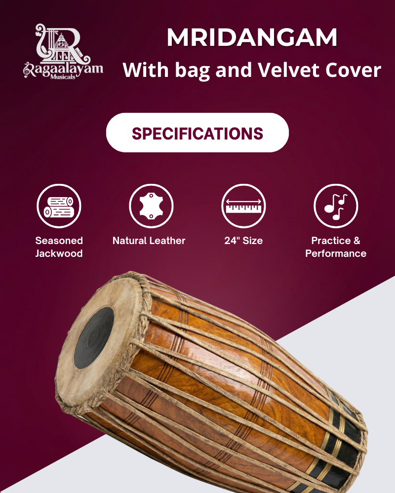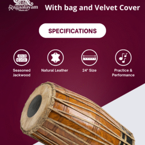The 24-inch Mridangam is a quintessential Indian percussion instrument used in Carnatic music and many traditional performances. It features two heads—the right head (valanthalai) producing crisp treble tones and the left head (thuralthai) delivering deep bass resonance. Its balanced tonal quality supports rhythmic patterns (tala) with clarity and expression.
