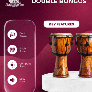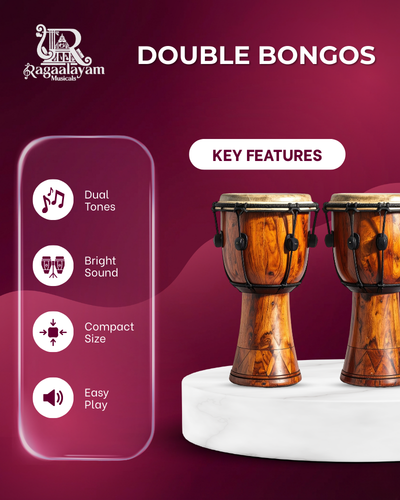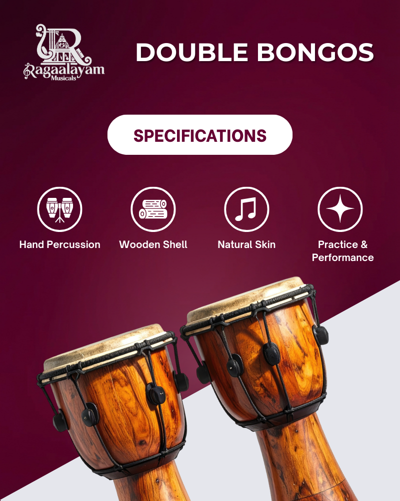 Designed for both beginners and more experienced players, double bongos are typically mounted on a stand or held between the knees. Their responsive drumheads allow dynamic hand techniques, facilitating expressive rhythm playing in practice, jam sessions, and live performance contexts. Lightweight and portable, this percussion set fits easily into home studios, classrooms, and performance settings.