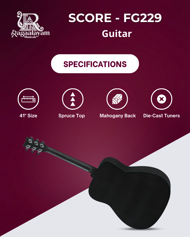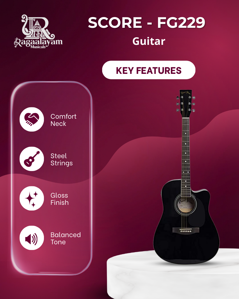 The Score FG229 Acoustic Guitar is built as a starter instrument for learners who want to begin playing guitar without complexity. Its full-size body provides adequate sound projection, making it suitable for solo practice and small group sessions.