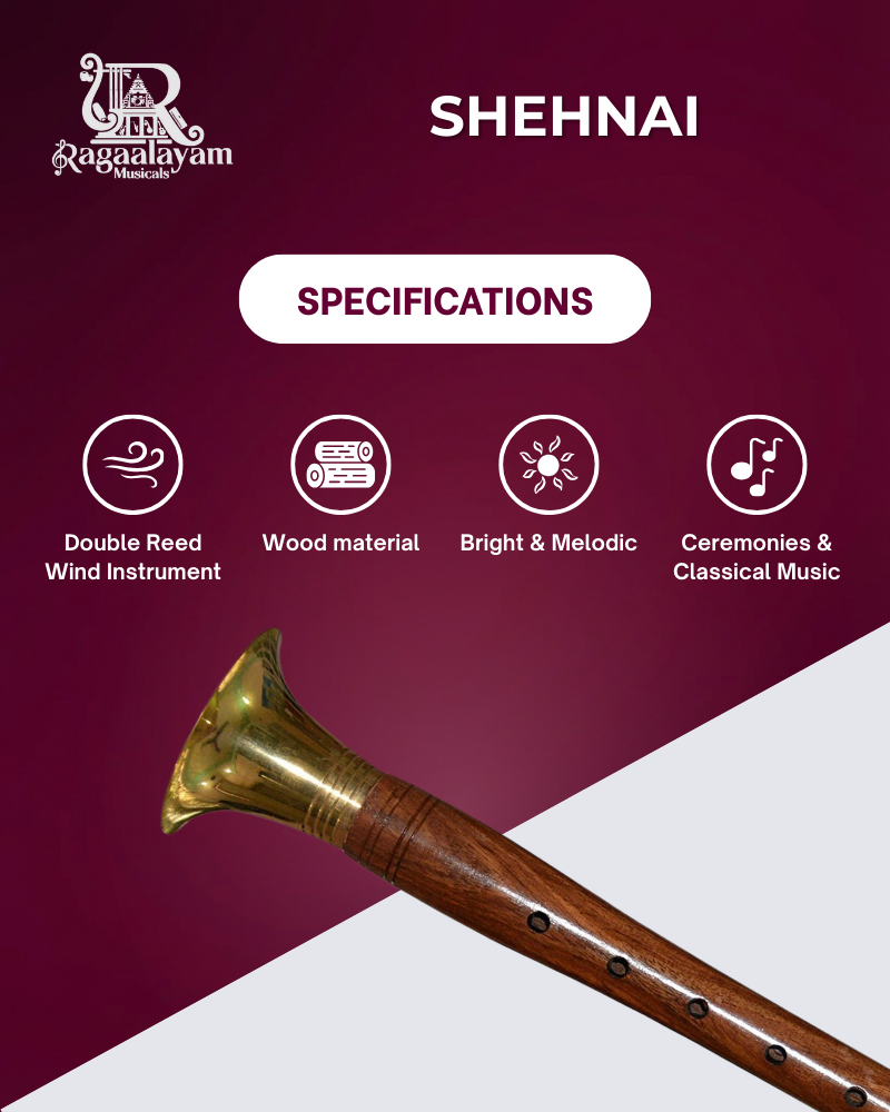 The Shehnai is a traditional Indian reed wind instrument with a distinctive sound that carries well in ceremonial and cultural settings. Made with a wooden body and a metal or reed flare bell, the instrument uses a double reed to produce warm, resonant tones. Its tonal character ranges from soft and melodic to bold and festive, making it a staple in classical and folk music traditions across India.