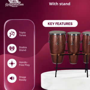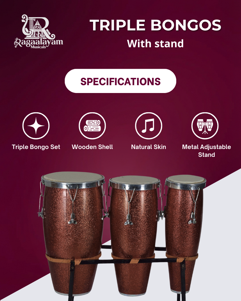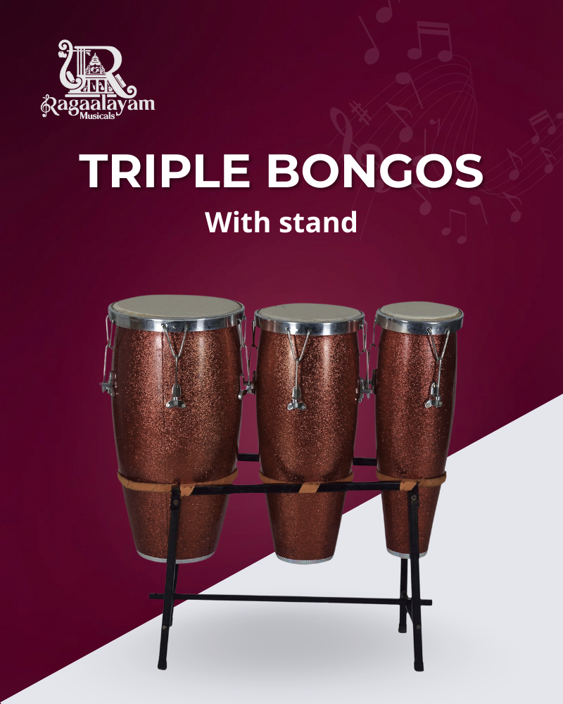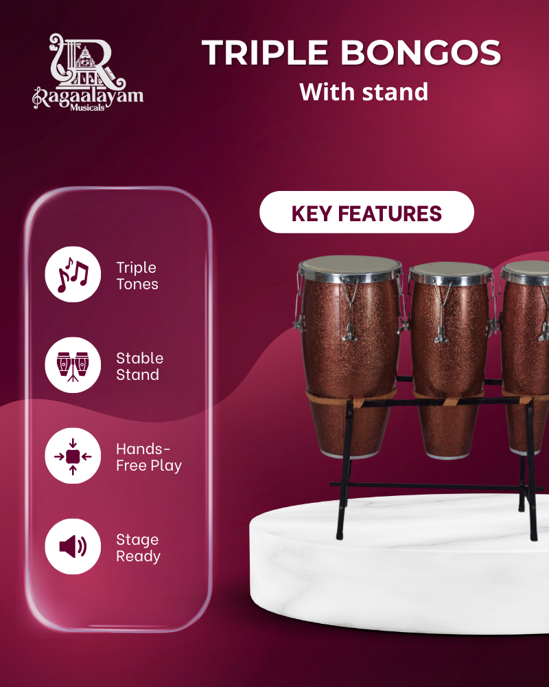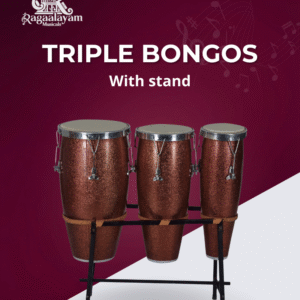 The Triple Bongos with Stand is a percussion set consisting of three hand drums mounted securely on an adjustable stand. Each drum delivers distinct tonal characteristics, allowing players to create complex and varied rhythms suitable for world, fusion, and contemporary music styles.